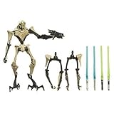 General Grievous is a brilliant strategist who has honed the droid army into a terrifyingly efficient fighting force. Part living matter and part machine, Grievous is skilled with a lightsaber and relishes any opportunity that allows him to duelaand defeataa Jedi. Get ready for battles of epic proportions with this awesome General Grievous figure! Send him charging into action and fighting for the fate of the galaxy with his interchangeable arms and four lightsaber accessories. Even when heas just standing at attention in your collection, this mighty hero is sure to inspire all kinds of out-of-this world adventures! Figure comes with interchangeable arms and four lightsaber accessories.